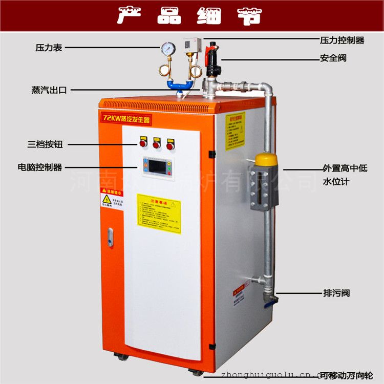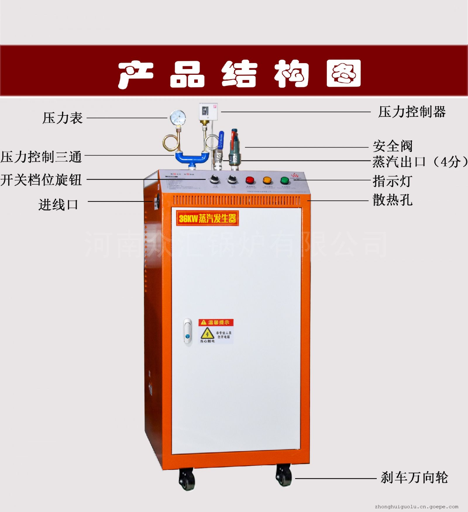 品牌:众汇 型号:LDR0.05-0.7 加工定制:是 出口压力:0.7Mpa 燃烧方式:室燃 循环方式:自然循环 燃料耗量:36KW 功率:36KW 蒸汽产量:50kg 有效水容积:28L 重量:200kg 用途:食品加工、蒸汽加热、混凝土养护、屠宰场、饲料厂 最高温度:170℃ 尺寸:800×700×1400mm 工作电压:380V 结构形式:立式 是否跨境货源:否 加热管材质:不锈钢 一、关于LDR0.065-0.4电蒸汽发生器的性能描述:豆腐加工36KW电加热蒸汽发生器 72KW蒸汽锅炉